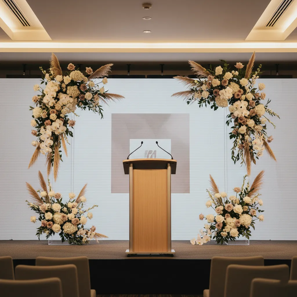 Gala arrangements, stage florals, branded styling & environmental florals crafted to enhance guest experience and support your brand presence with a refined, modern visual impact.